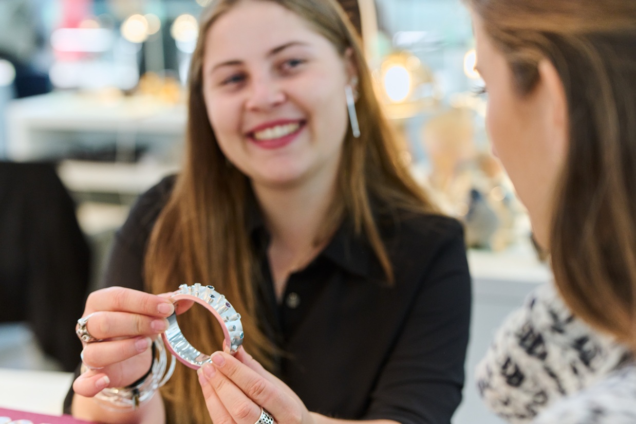 Gerade in Zeiten des Fachkräftemangels ist die Nachwuchsförderung von entscheidender Bedeutung. Deshalb sind auf der Messe regelmäßig Ausbildungsinstitute, Schulen und Weiterbildungseinrichtungen vertreten, um junge Talente zu informieren und ihnen berufliche Perspektiven aufzuzeigen. Dieses Jahr sind unter anderem die Berufsbildende Schule Idar-Oberstein und die Goldschmiedeschule Pforzheim mit dabei. Ein Highlight ist das Team aus Pforzheim, das mit Werkbänken und Maschinen anreist, um die Ausbildung zum Goldschmied hautnah zu demonstrieren.