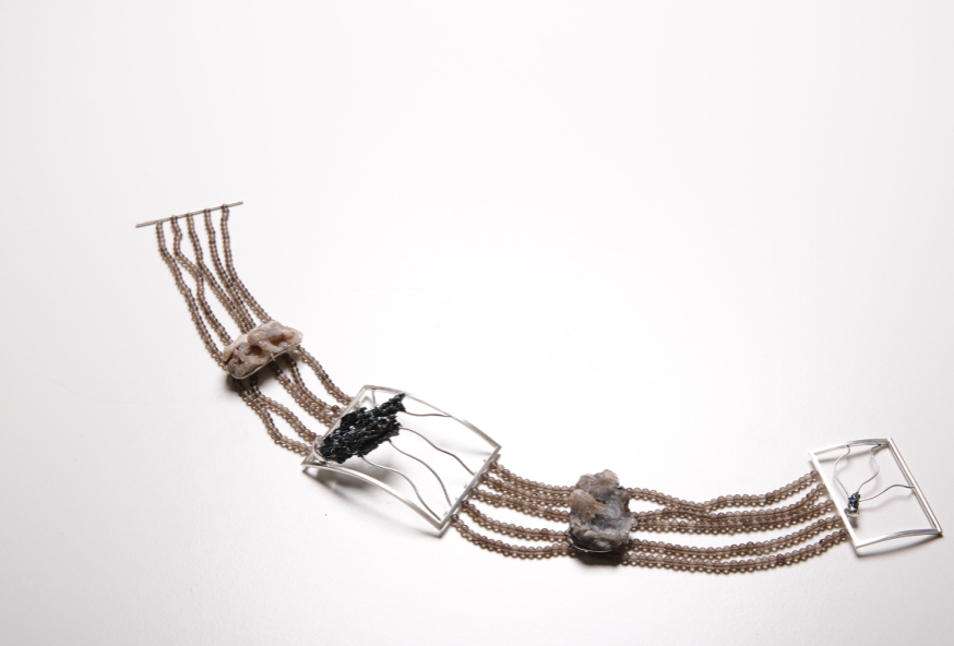 The silver (925) necklace heavily refers to the Art Nouveau style, bringing to mind celestial bodies traveling through our solar system. The main panel was designed to add the asymmetrical quality to the composition, while keeping in mind the art nouveau design traditions of meandering vines. Framed in a silver“comet”, silicon carbide is supposed to bring to mind something extraterrestrial with its texture and shape. The material was chosen because of its history: it was first discovered in a meteorite. The repeated comet motif in the hidden clasp is intended to symbolize its returns. Strings of smoky quartz mute the rich color and texture of the necklace. All settings should be as little visible as possible, without distracting attention from the story told by the necklace. Chalcedony that were placed on the sides resemble nebulae. The necklace is meant to surround the person who wears it, reminding them that they are part of something bigger. A concept that was here before them and will return after their demise.